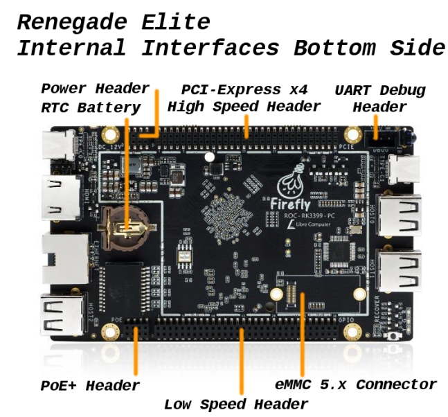 Renegade Elite оснащён 4 ГБ ОЗУ, имеет кардридер MicroSD, интерфейс для накопителей eMMC 5.x, HDMI 2.0, гигабитный Etherenet и два порта USB 2.0 в дополнение к двум USB Type-C (один из которых используется для питания). Также имеется ИК-приёмник, разъём для батарейки RTC, 60-контактный разъём PCIe и низкоскоростной 60-контактный разъём.