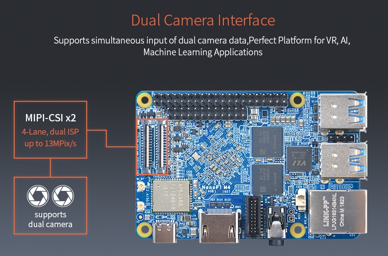 Также присутствует 40-контактный разъём GPIO, 24-контактный разъём GPIO, четырёхполосный интерфейс MIPI DSI и сокет для подключения модуля eMMC.