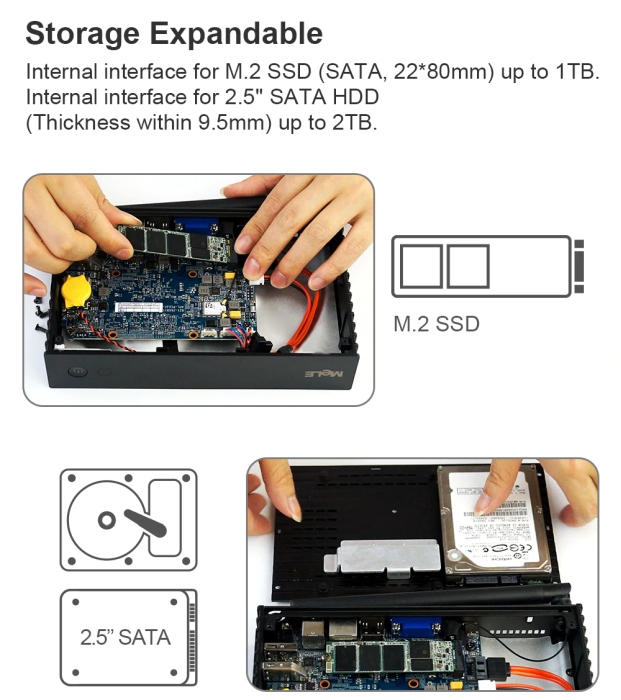 Внутри корпуса доступен слот M.2 2280, для установки дополнительного накопителя SSD, и 2,5-дюймовый отсек. Есть порты HDMI 2.0, VGA, два USB 3.0, два USB 2.0, USB 3.0 Type-C, 3,5-мм аудиоразъём, Wi-Fi 802.11ac, Bluetooth 4.2, гигабитный Ethernet и кардридер.