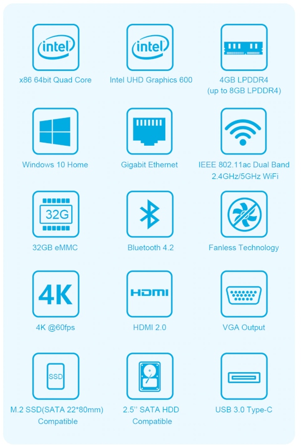 Компьютер оснащён 10-ваттным четырёхъядерным процессором Intel Celeron J4105, с графикой Intel UHD 600. В наличии 4 ГБ оперативной памяти, накопитель eMMC объёмом 32 ГБ и предустановленная операционная система Windows 10 Home 64-бит.