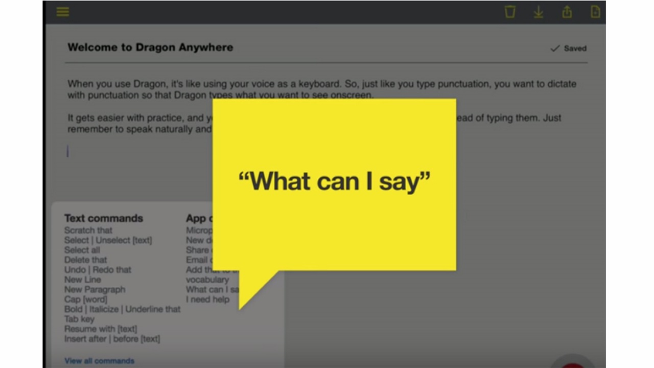 Кроме надиктовывания и точного речевого распознавания приложение обещает изучать голос пользователя для повышения точности и поддержки специфичных для различных сфер деятельности выражений и слов. Возможность надиктовывать текст не ограничена ни по времени, ни по объёму. Опции форматирования и редактирования включают выбор слов и предложений для редактирования или удаления, навигацию через поля шаблонов и применение распространённого форматирования текста.