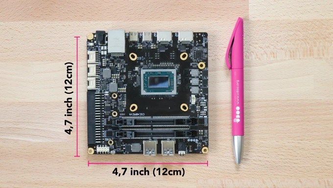 Одноплатник имеет размеры 12 × 12 см, и в зависимости от версии, может быть оснащён процессором Ryzen Embedded V1202B (с графикой Radeon Vega 3) или Ryzen Embedded V1605B (с графикой Radeon Vega 8).