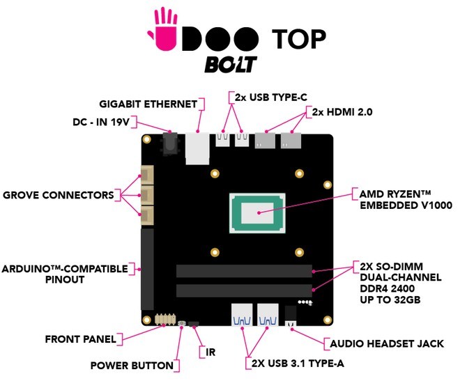В конце марта должны начаться поставки одноплатного компьютера UDOO BOLT с процессором линейки Ryzen Embedded V1000 от AMD.