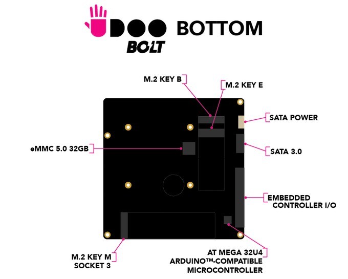 UDOO BOLT имеет встроенный накопитель eMMC 5.0 объёмом 32 ГБ, поддерживает SATA-накопители и оснащён слотом M.2 для подключения SSD. В наличии два слота SODIMM, поддерживающих до 32 ГБ памяти DDR4-2400.