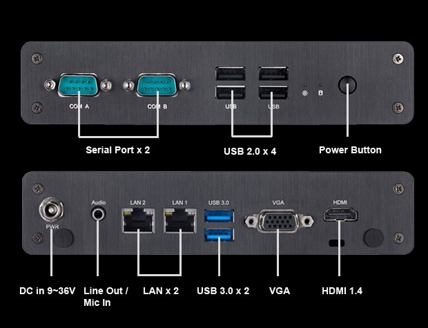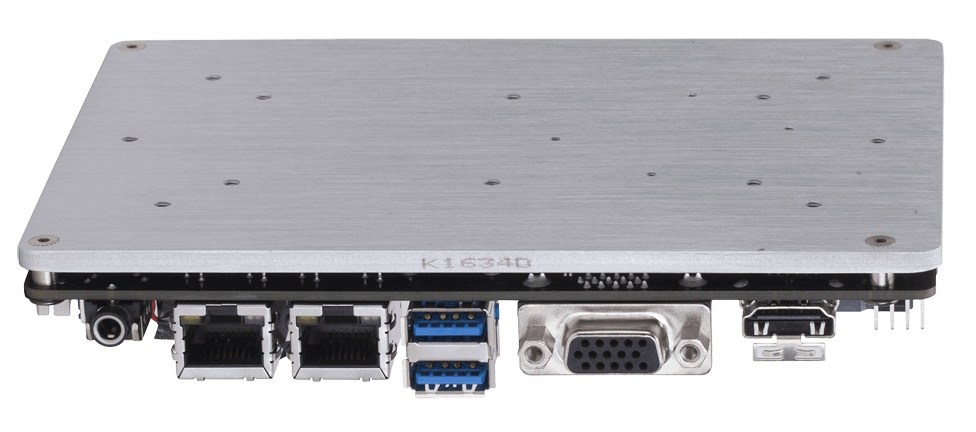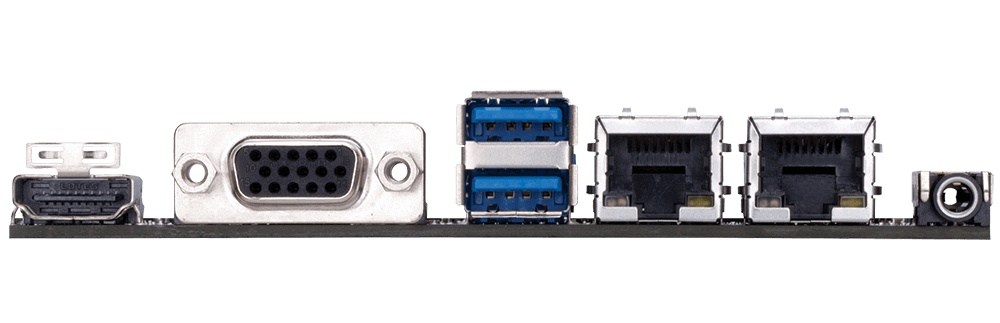 Также в наличии два слота mini-PCIe, для подключения накопителя и карты Wi-Fi. Есть два разъёма SATA 3, два порта USB 3.0, четыре порта USB 2.0, два Gigabit Ethernet, аудиоразъём, HDMI и VGA.